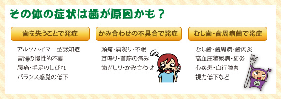歯は、前歯で食べ物を摂取してかみ切り、 奥歯で細かく砕いてすりつぶすという役目を果たしているほか発音などにも関与している大切な器官です。 一般に歯の病気は生命に直結しないという印象があるので治療が遅れがちになりますが、 歯が悪い為に胃腸に障害が起きたり、頭痛や肩凝りに悩む人もいます。 更に歯の病気が原因でできた毒素や細菌が血液やリンパの流れに乗って身体の他の部分に運ばれ、 重病を引き起こす事もあります。 また、歯ぐきの腫れや歯のゆるみ、しこりが糖尿病などの症状という事もあるので油断は禁物です。